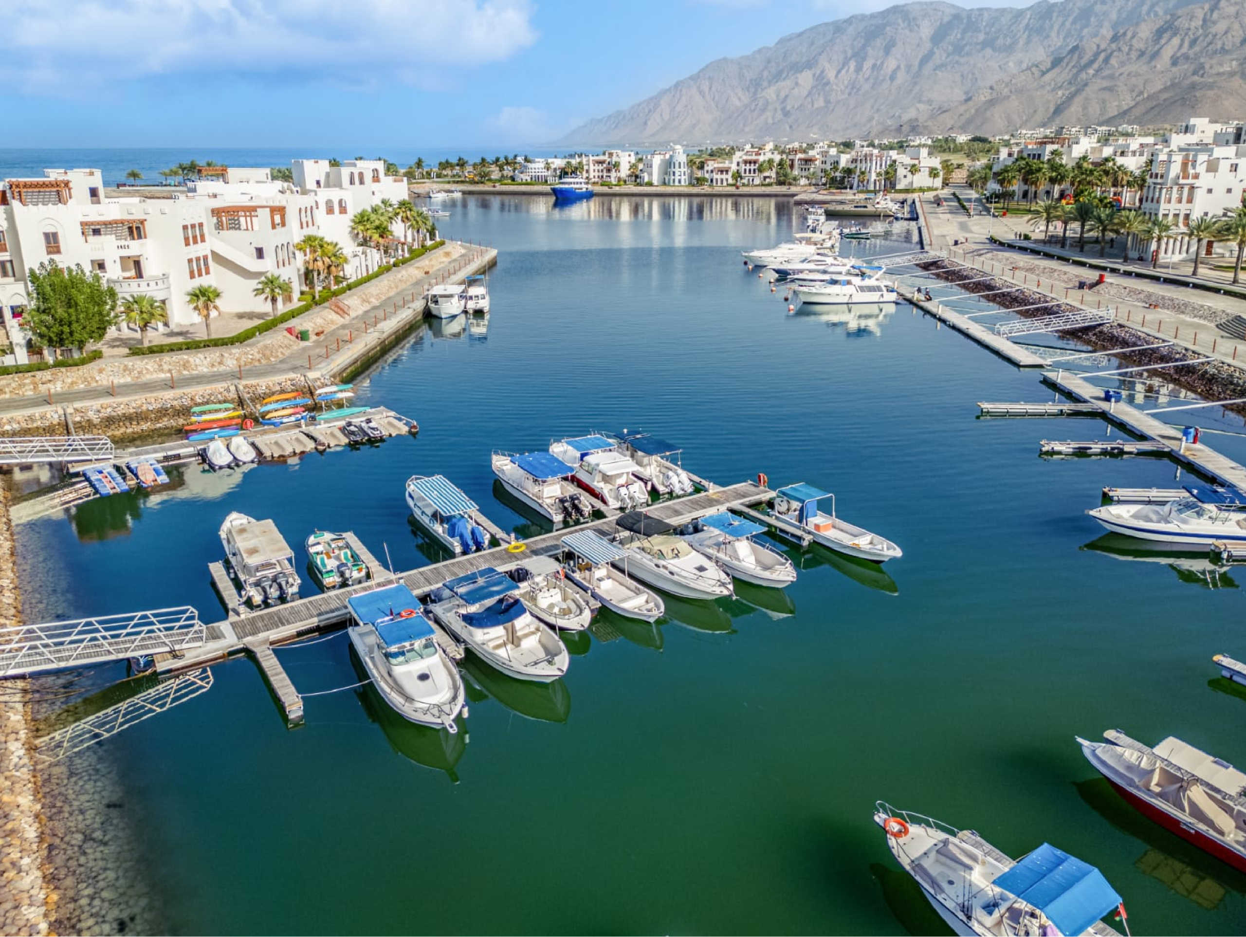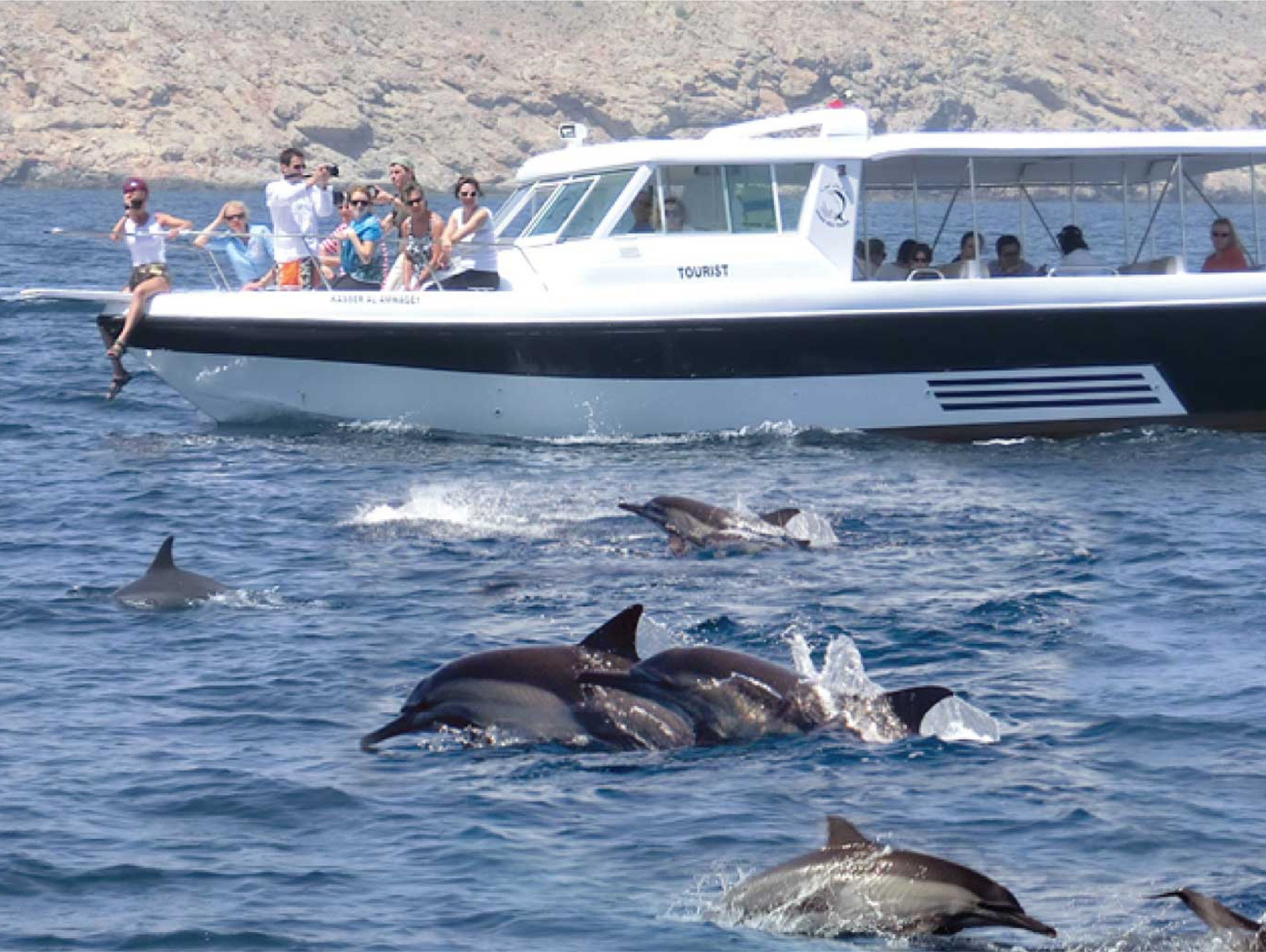 At the marina, you board your dolphin boat Salalah, meet the crew, and begin cruising along the coastline.